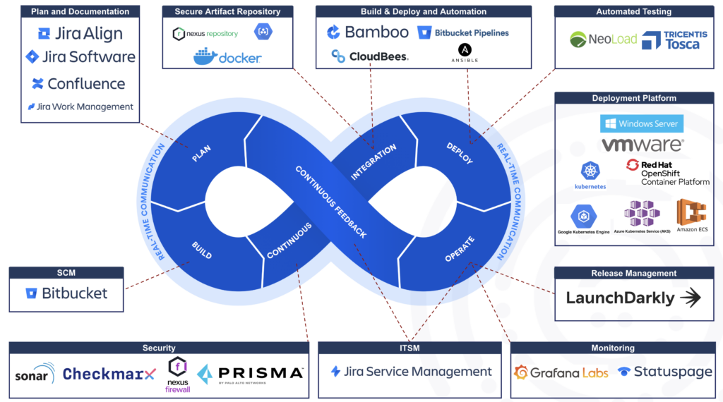 Code quality, security and vulnerability testing with SonarQube, Snyk, Checkmarx, and JFrog.